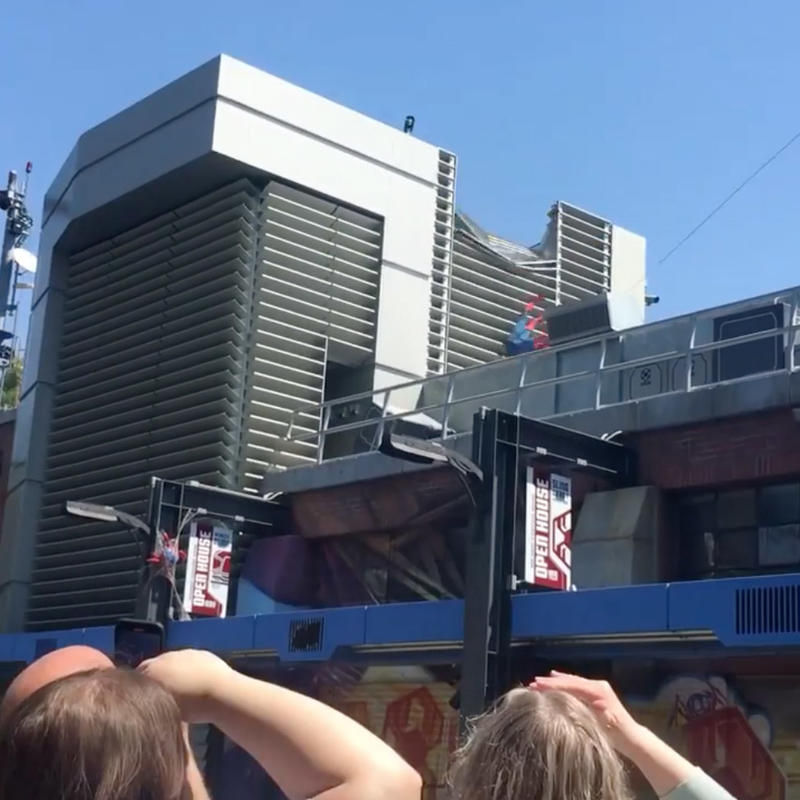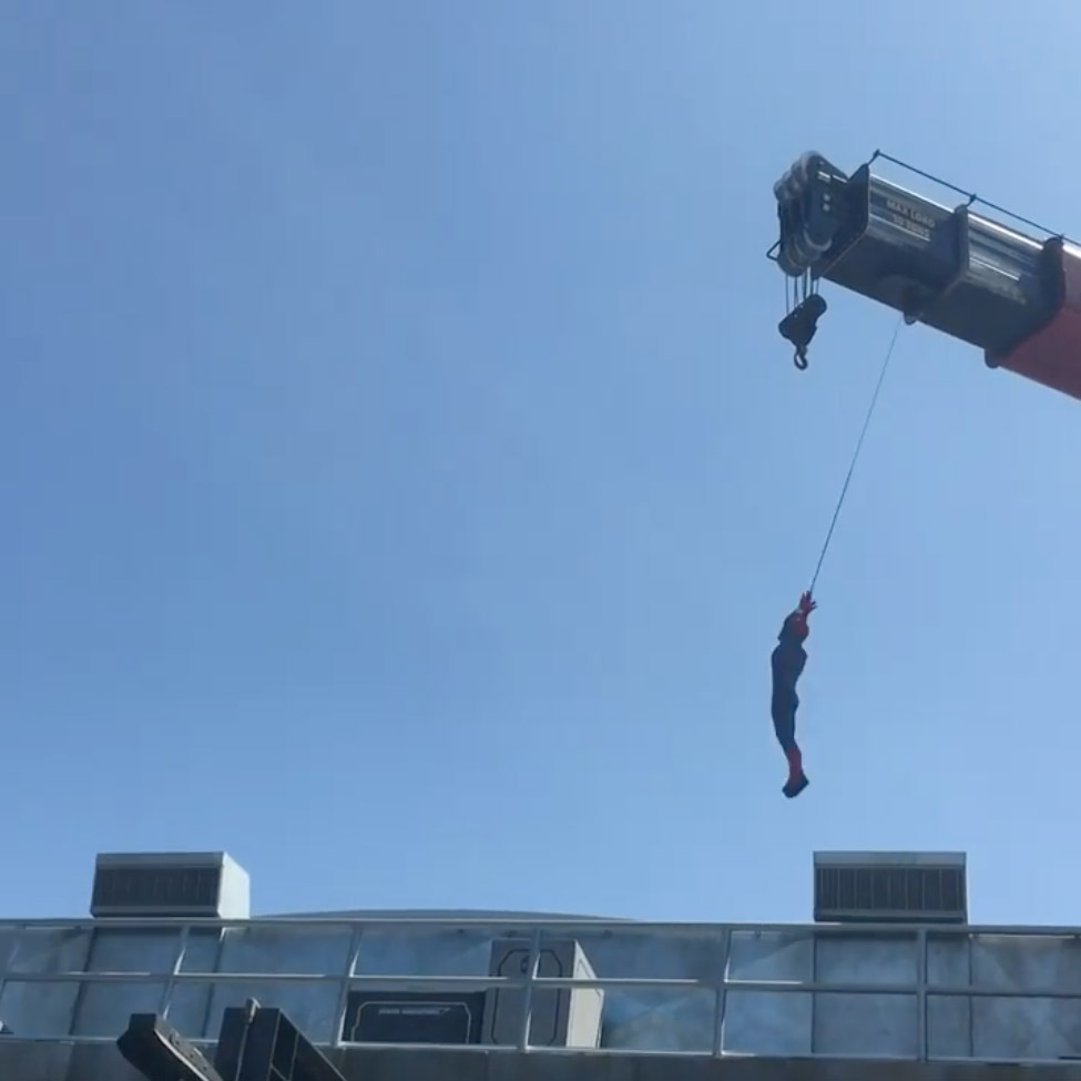 In the video, the stuntman dressed as Peter Parker’s alter ego Spider-Man can be heard saying “Here goes something” before launching into the air.