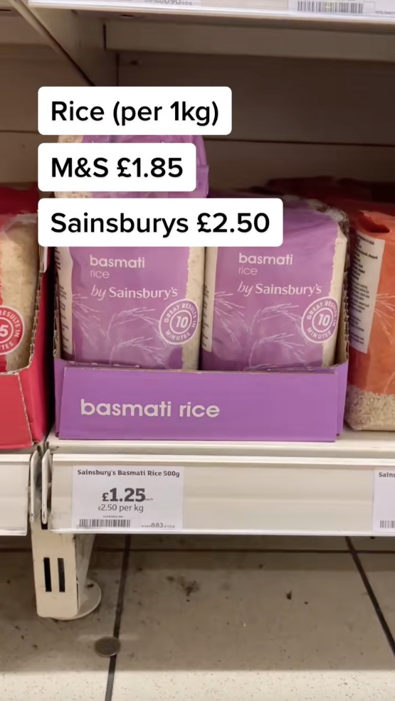 She starts by showing the difference between a bag of rice which costs £2.50 per kilo from Sainsburys but only £1.85 per kilo from Marks and Spencer’s.