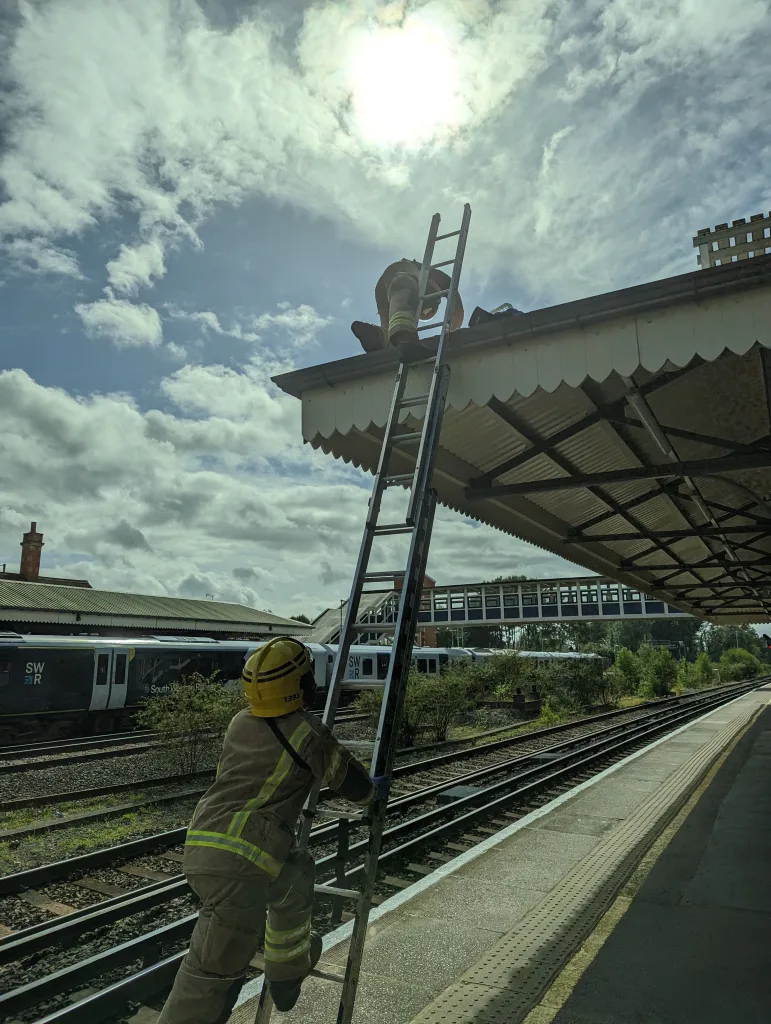 Firefighters used a ladder to climb up to the station roof in Farnborough Main railway station, Hampshire.