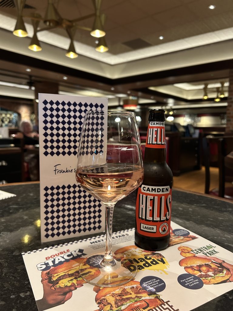 First, we ordered drinks and a starter — a lovely glass of house rosé, a beer, and a garlic bread sharer.