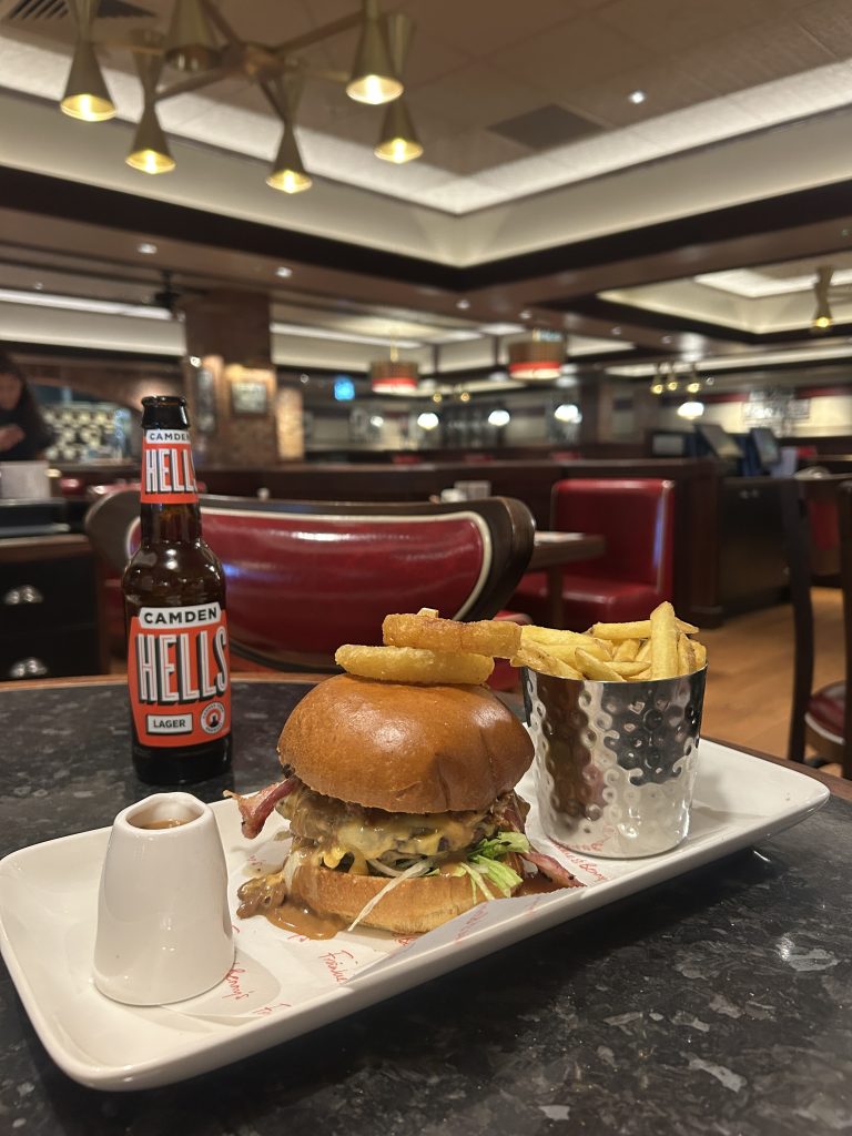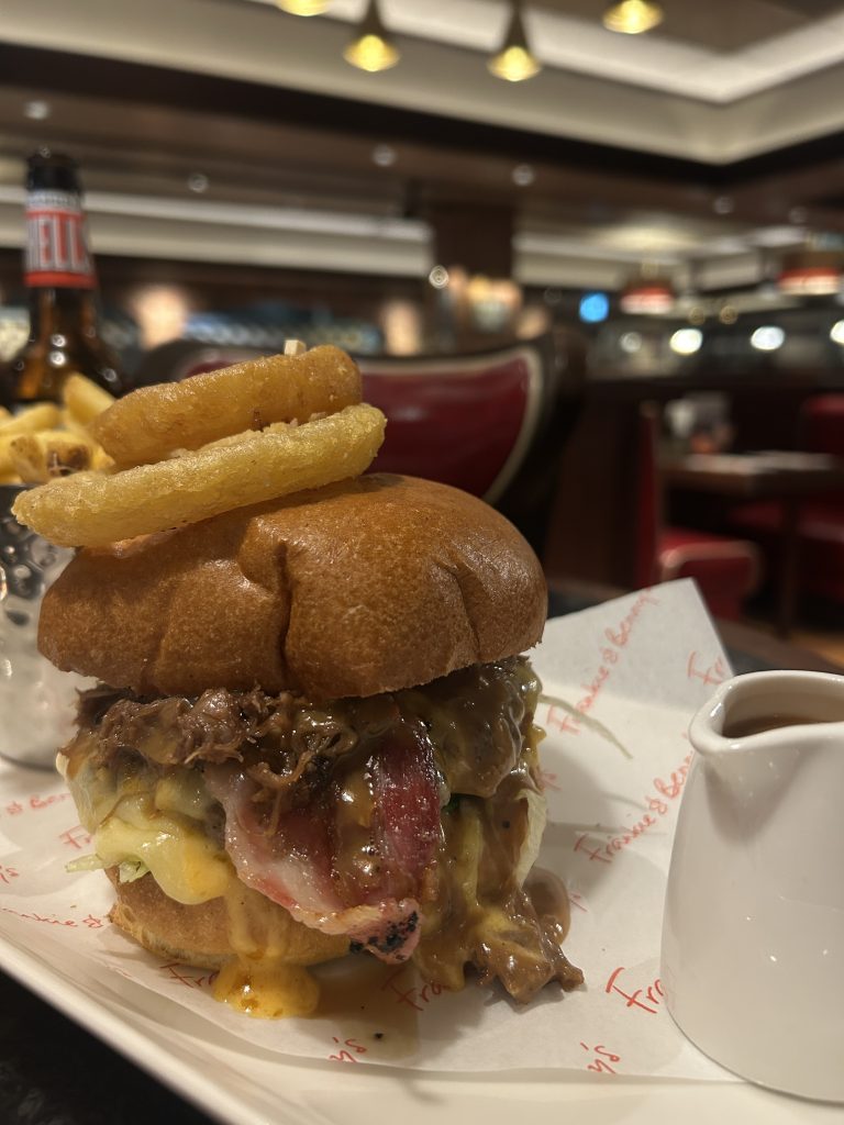 The Steakhouse arrived dripping with brisket, topped with onion rings, peppercorn sauce, and served alongside crispy fries.